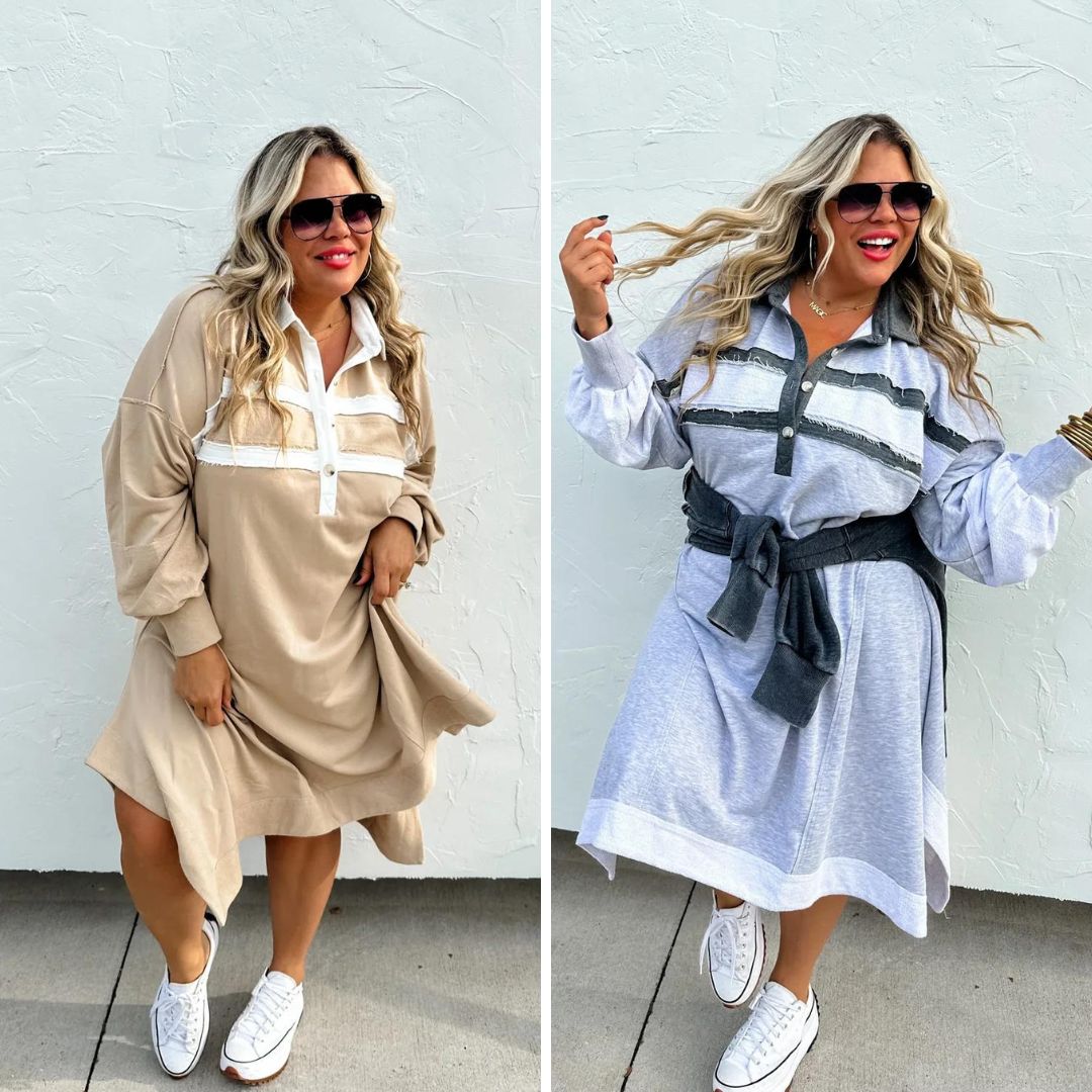 This varsity-inspired look is super cozy, oversized, and will definitely become your new favorite go-to dress!!  Features a polo style collar with a deep button neckline, raw hemming and reverse terry fabric detailing on the front stripes, arms and bottom hemming.  Every attention to detail was made with this amazing dress!