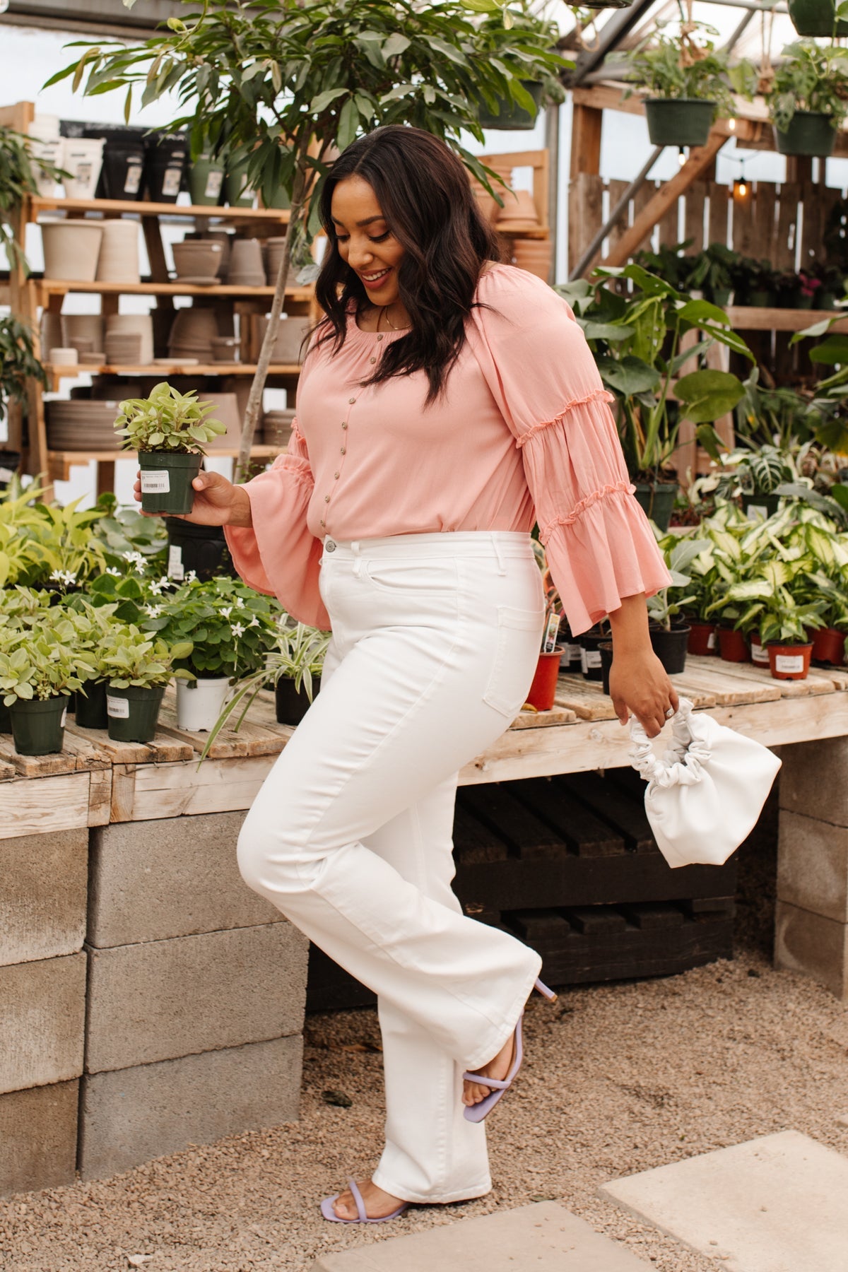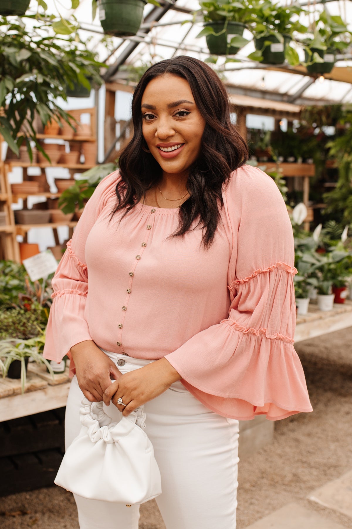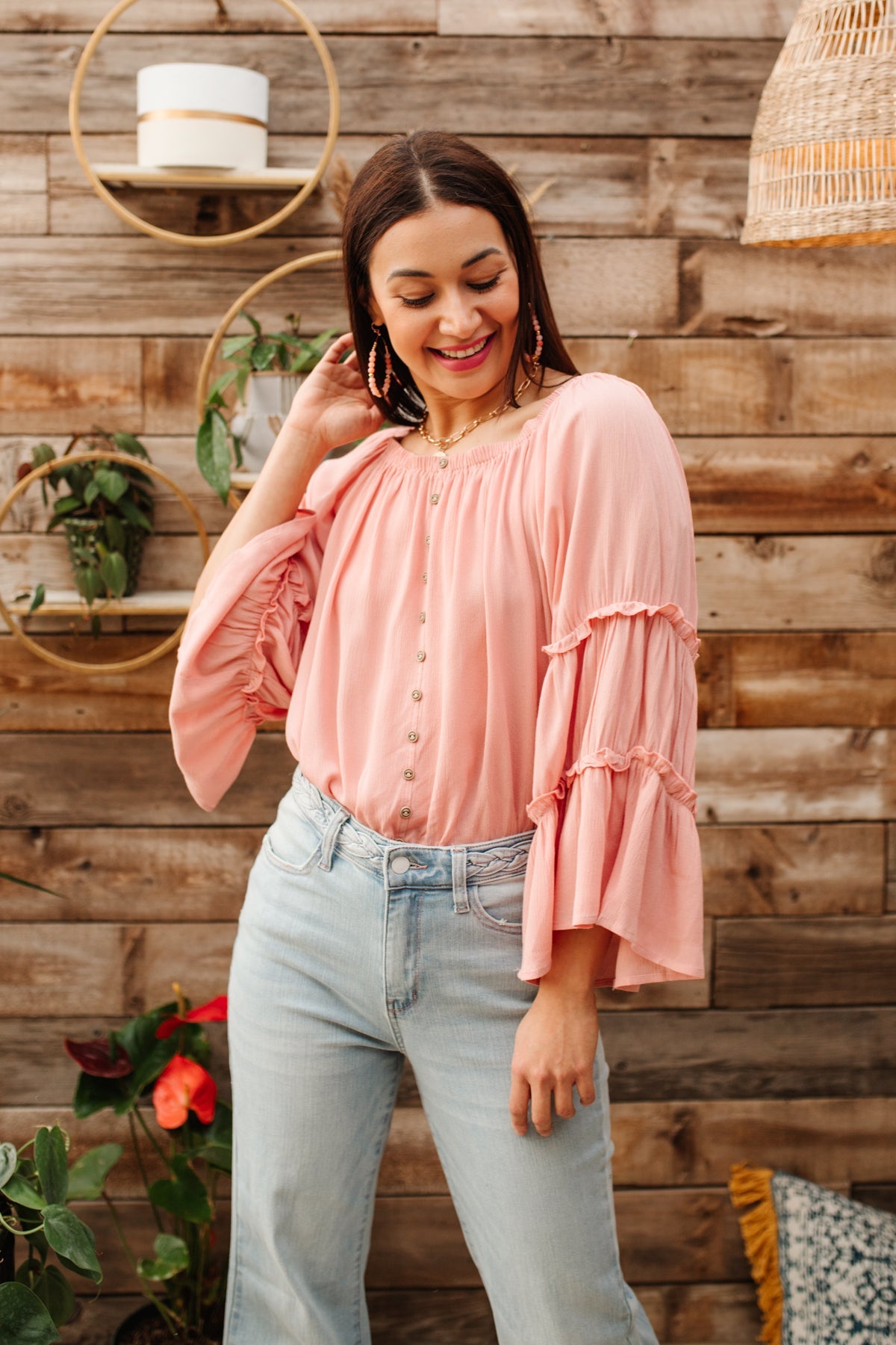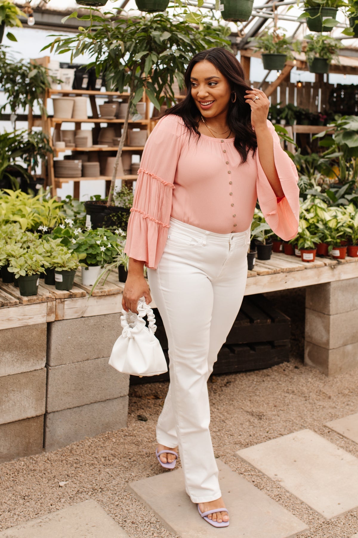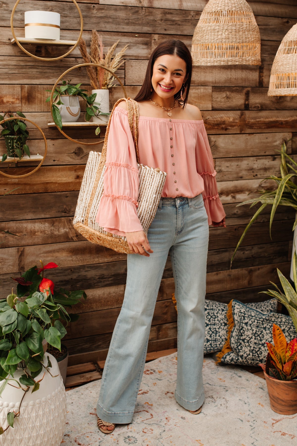 The Sunset Sailing Bodysuit has a dreaming of summer nights spent on a yacht! This stunning top is composed of an off shoulder silhouette, a button placket down center front, and bell sleeves with a dainty ruffle detail, all shaped from a lightweight gauzy fabric.