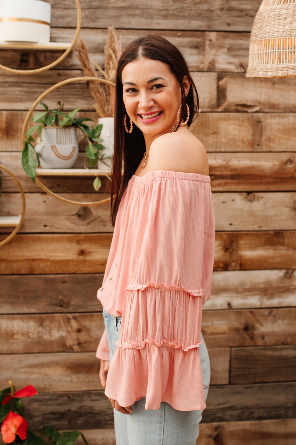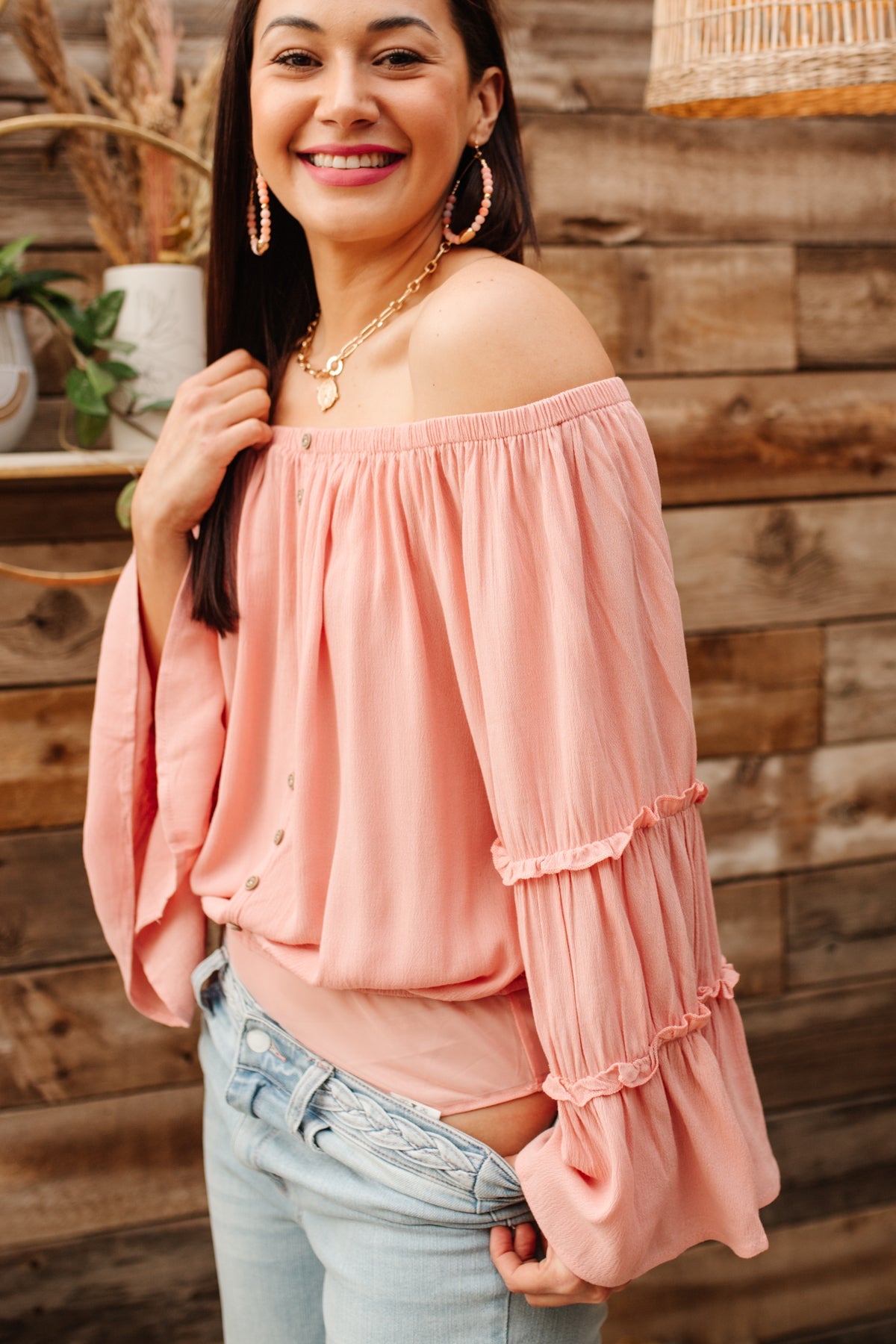 Keywords: Pink, Salmon, Bodysuit, Off Shoulder, Bell Sleeve